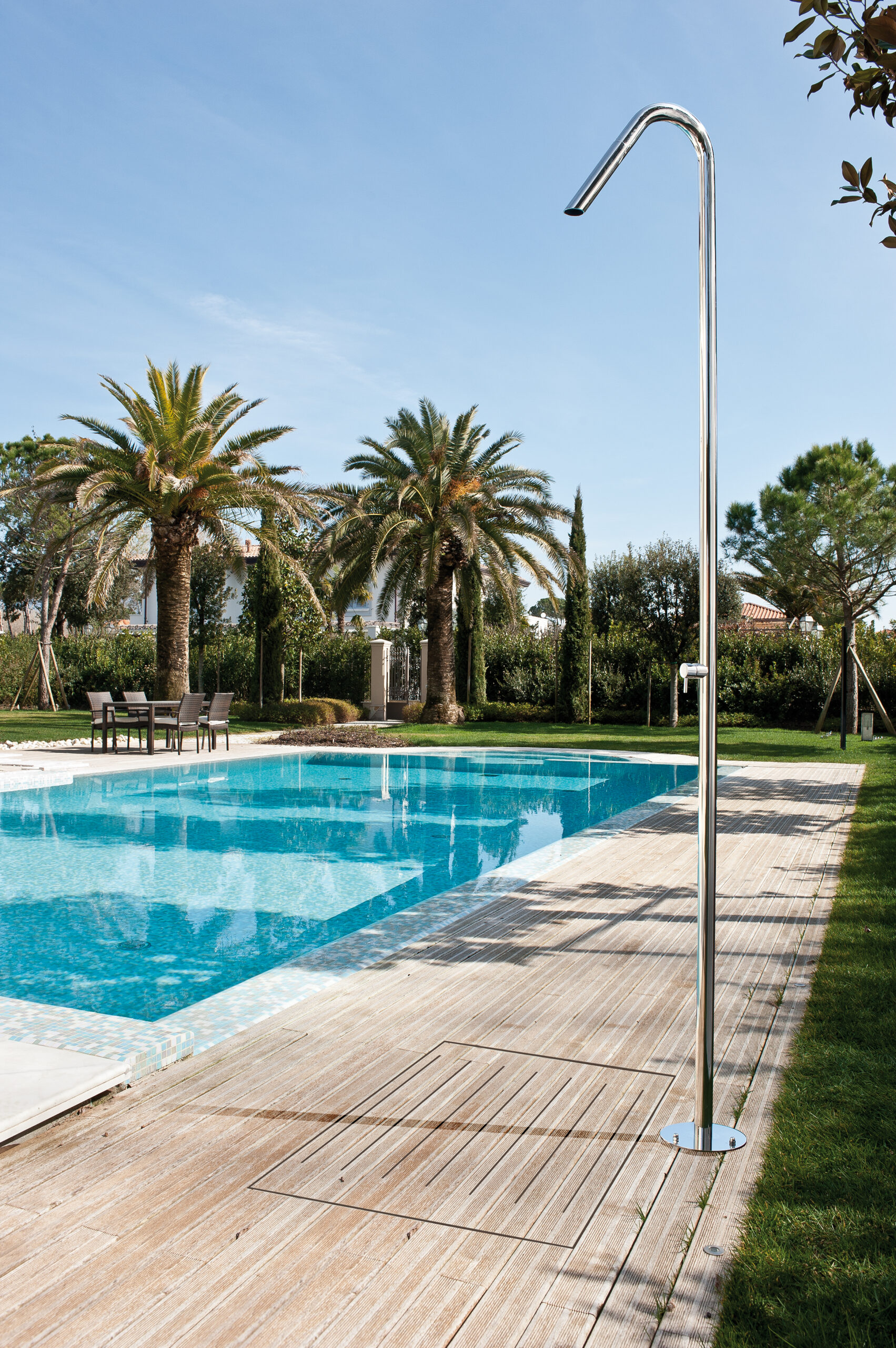 Fijación al suelo por medio de varillas, tuercas tapas y arandelas, todo en acero inox Aisi 316